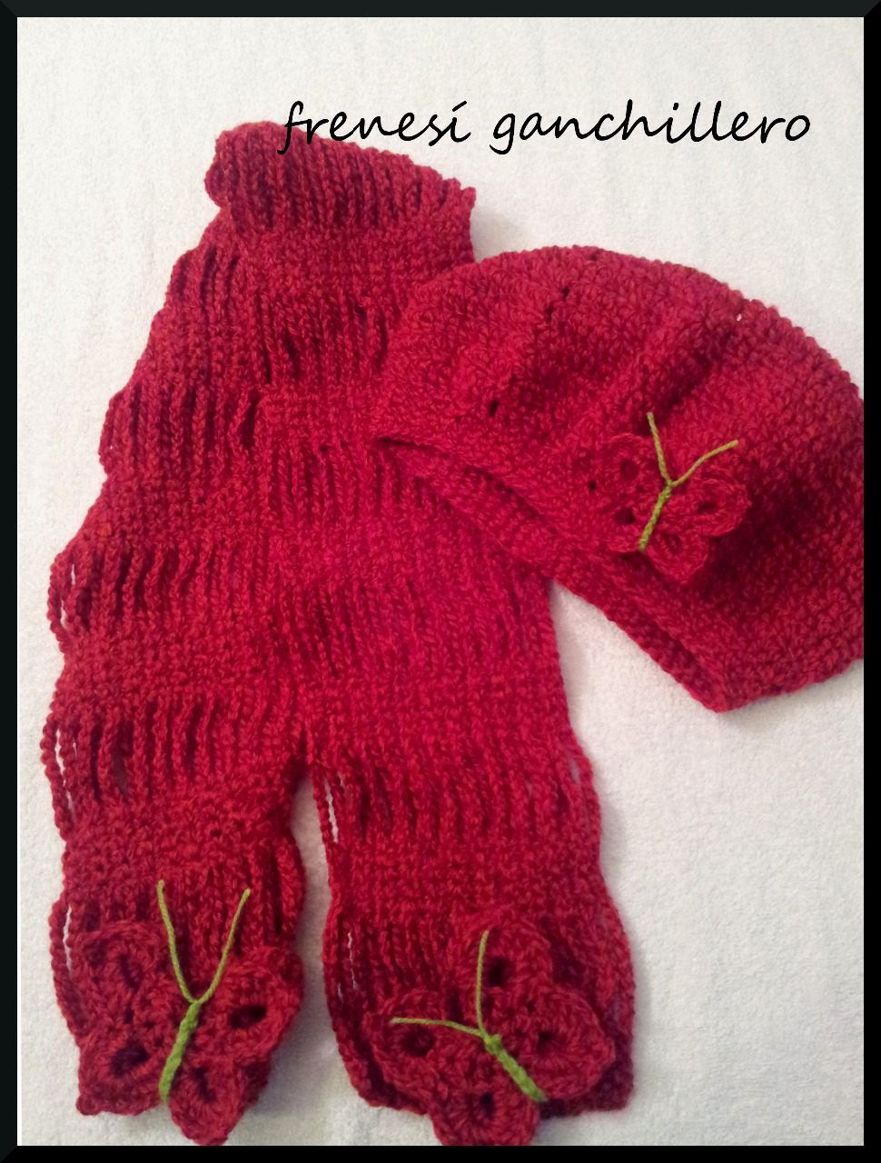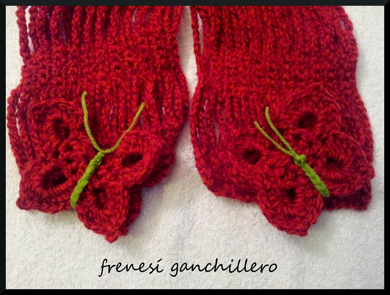 Primero con los detalles, aunque se suele hacer al revés. Estas mariposas (un poco más grandes) van en la bufanda.